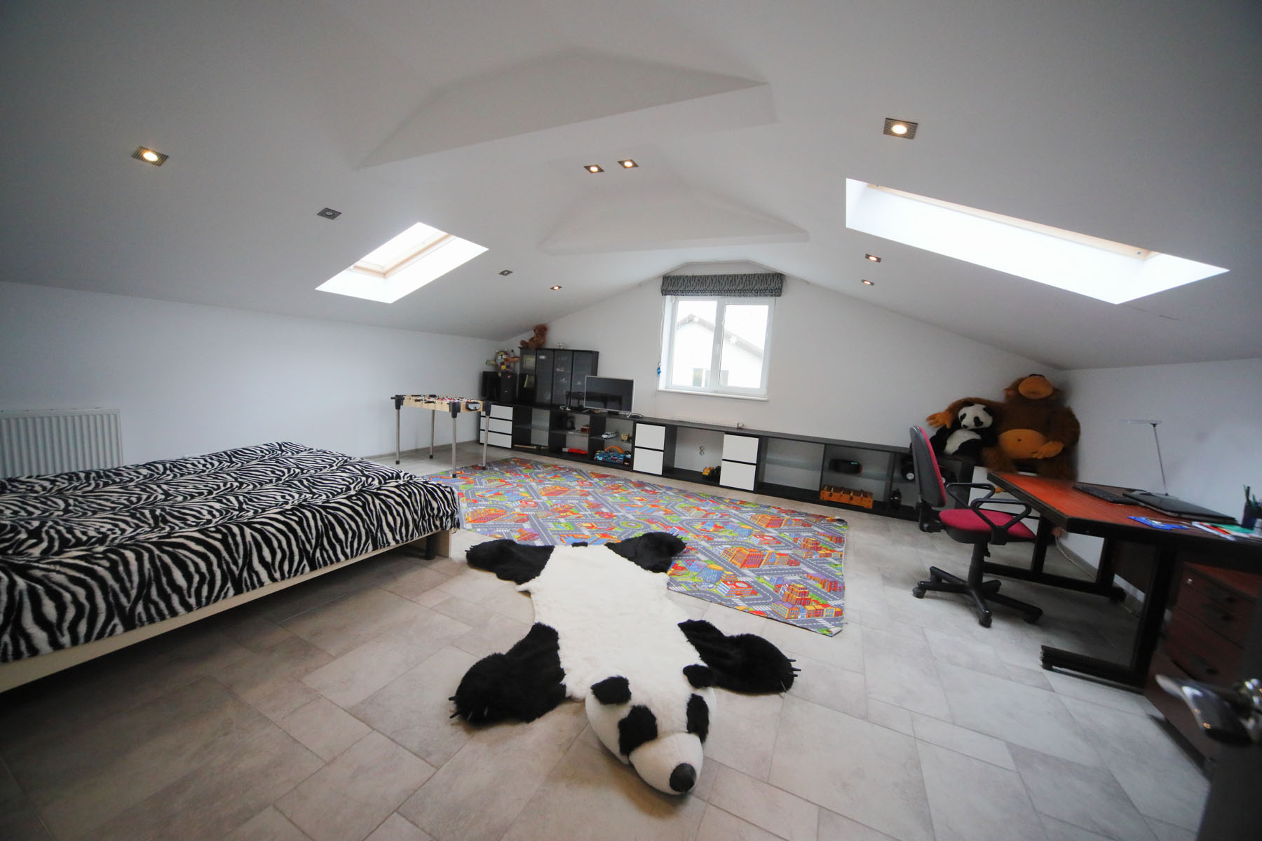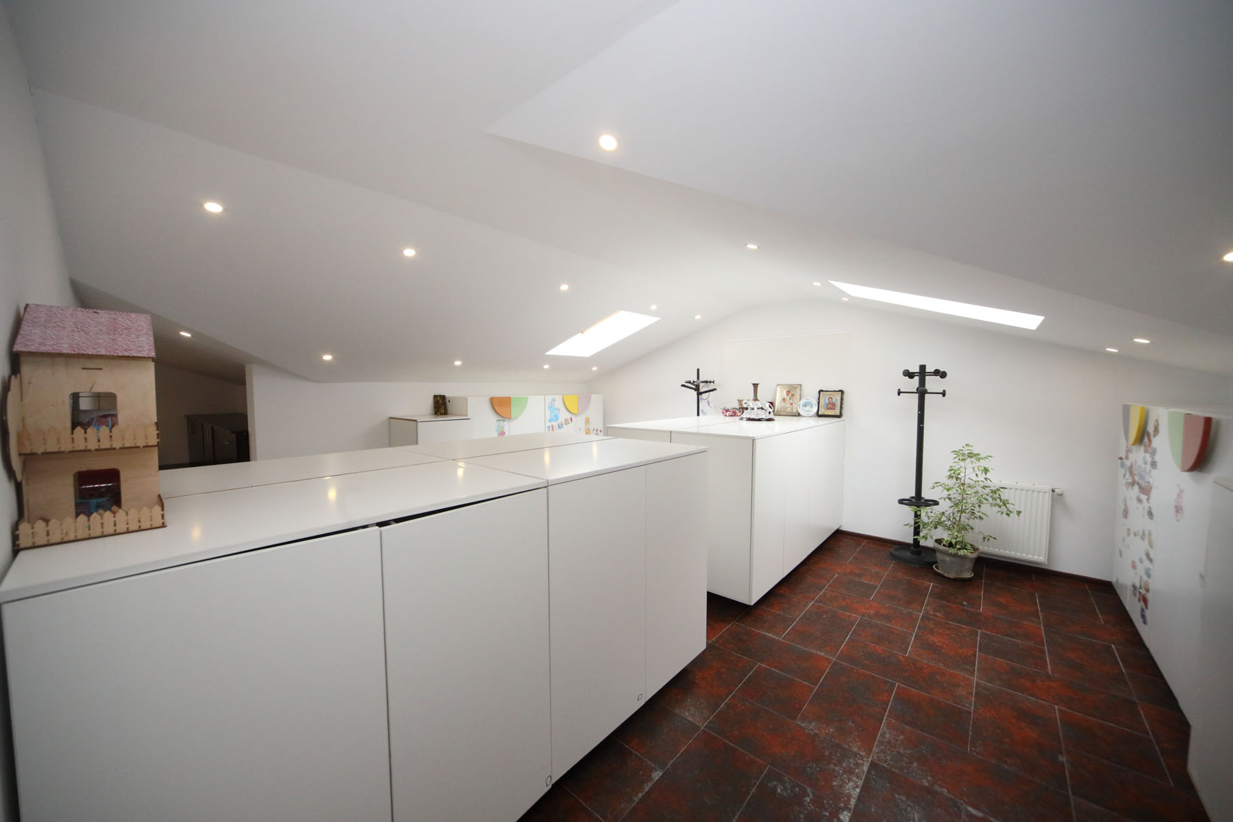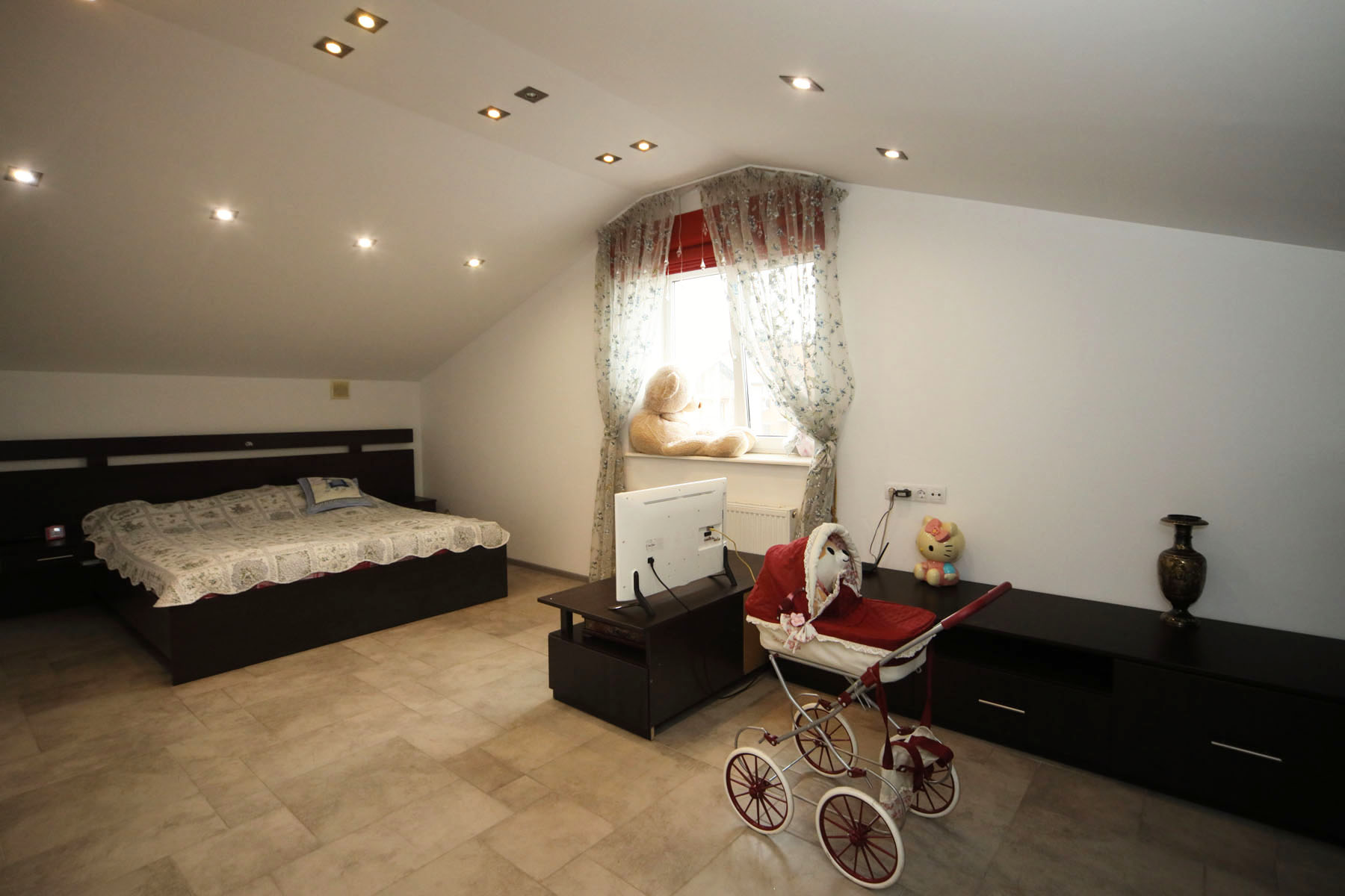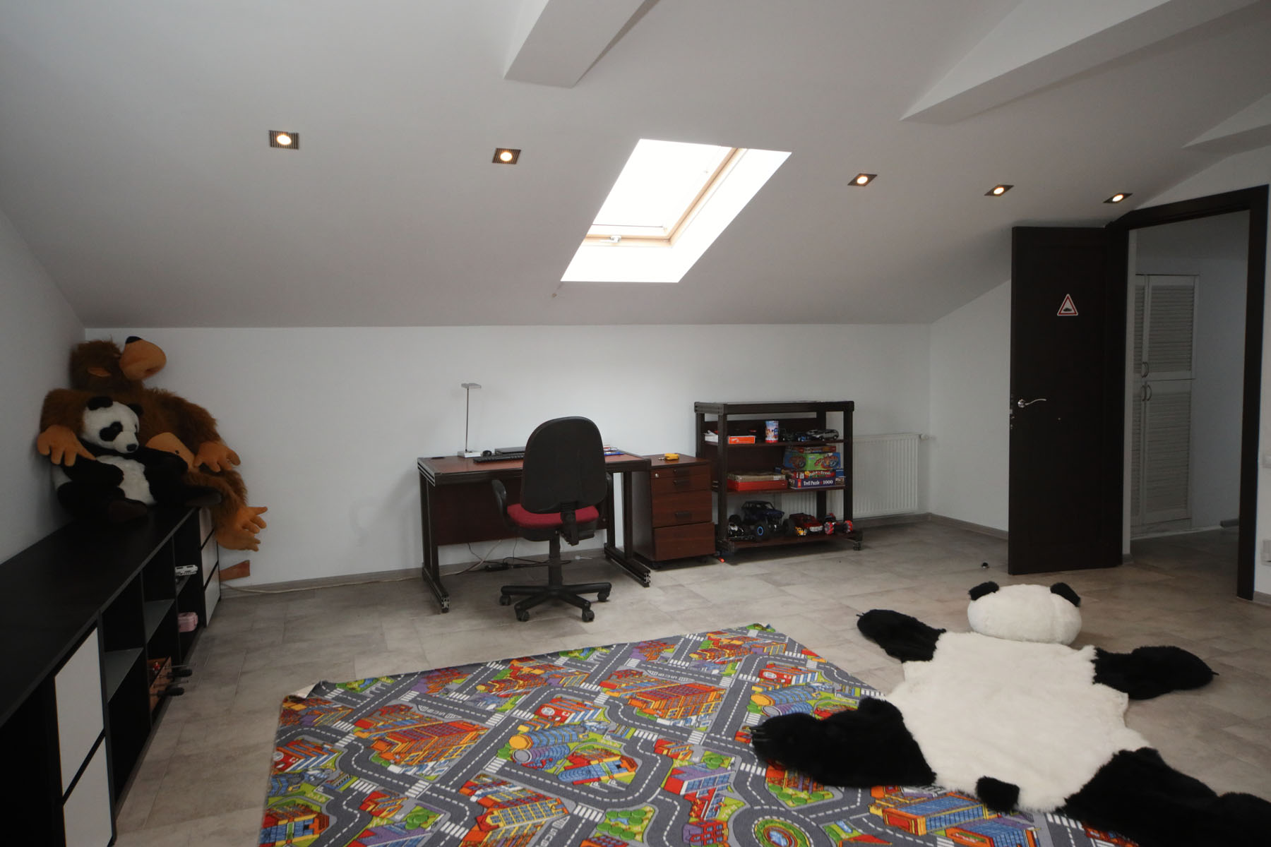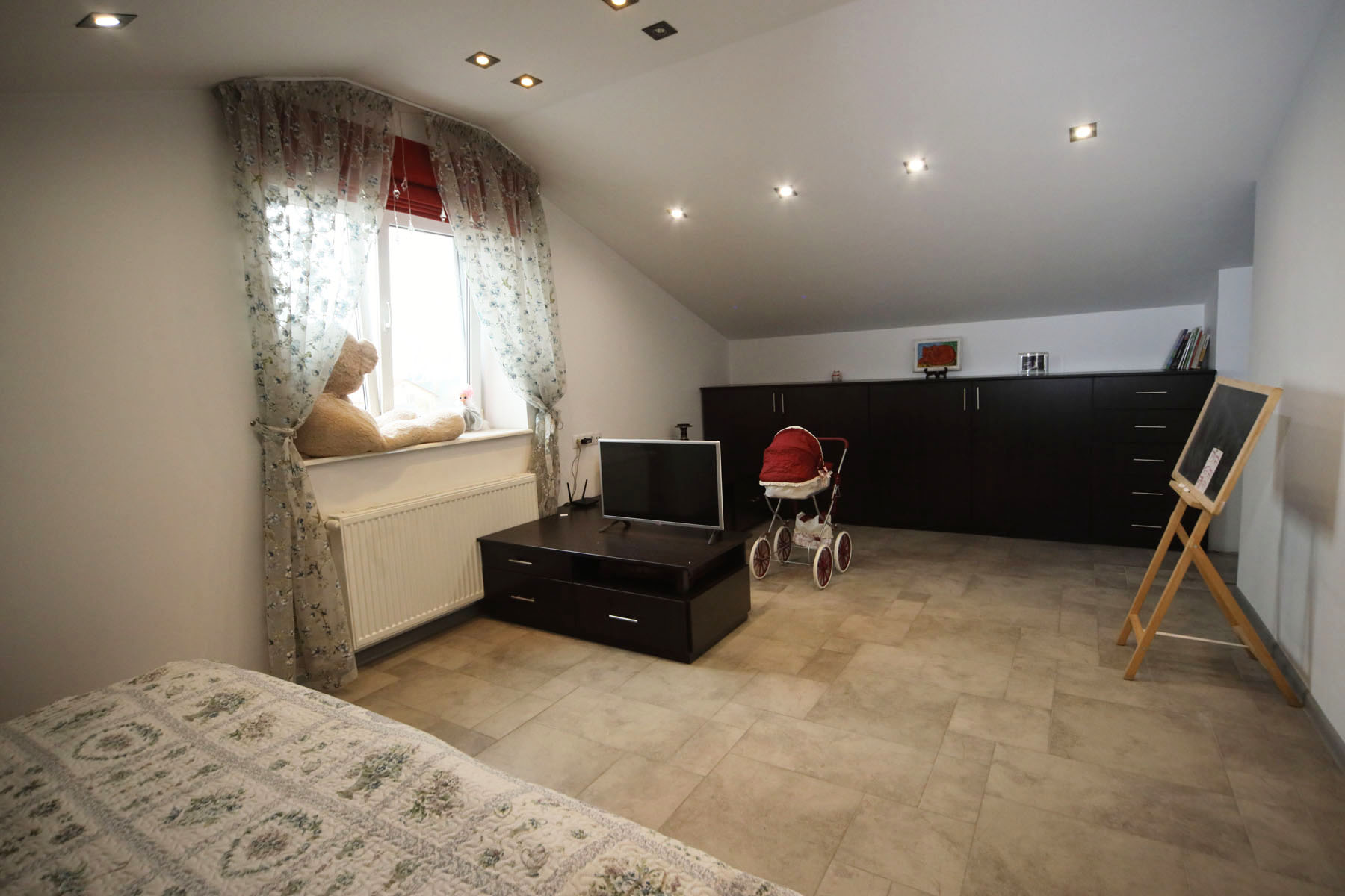 Простора дитяча кімната з одним фасадним і двома мансардними вікнами, що дають максимум природнього світла вдень, і точкове освітлення для темної пори.