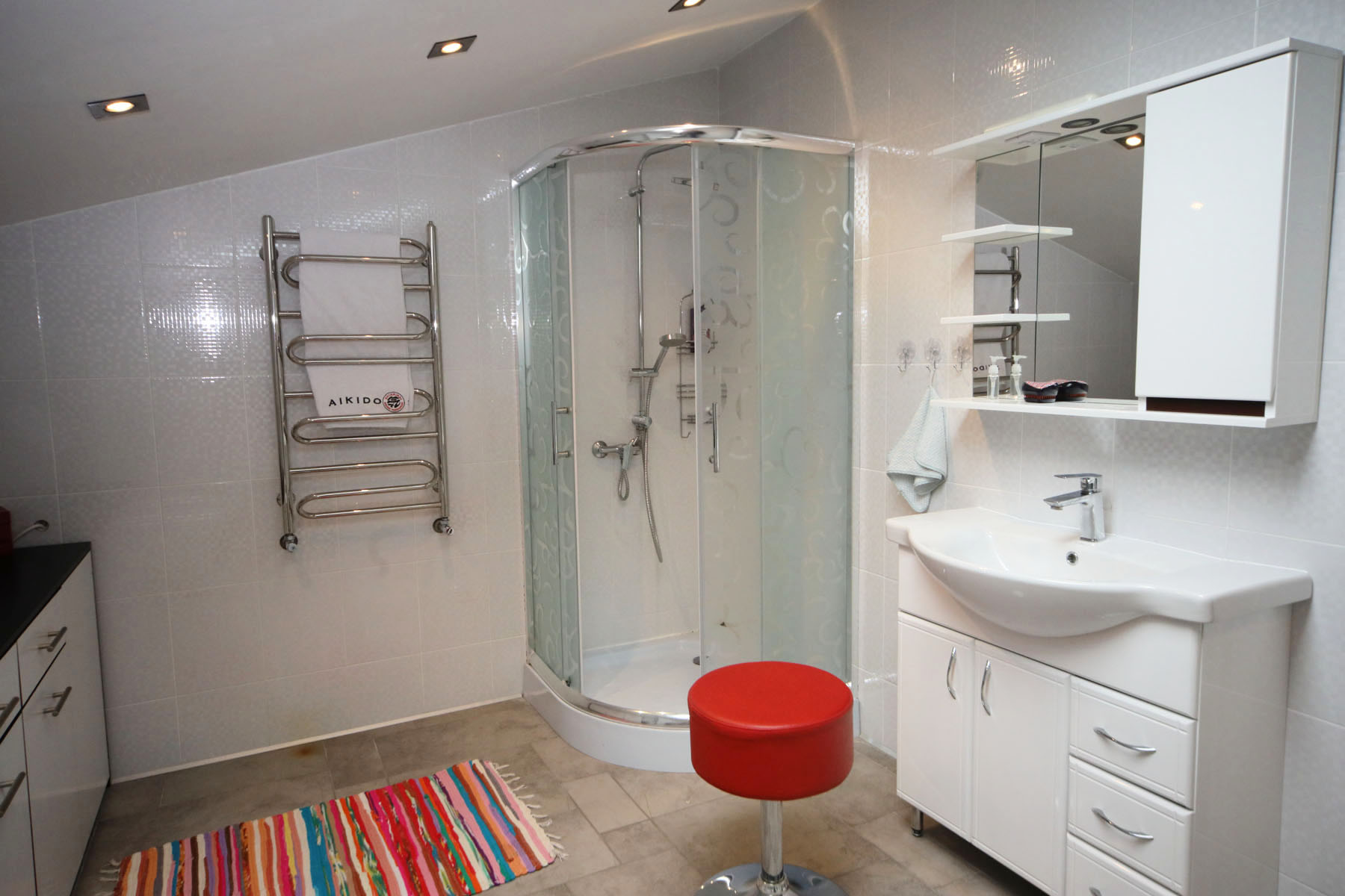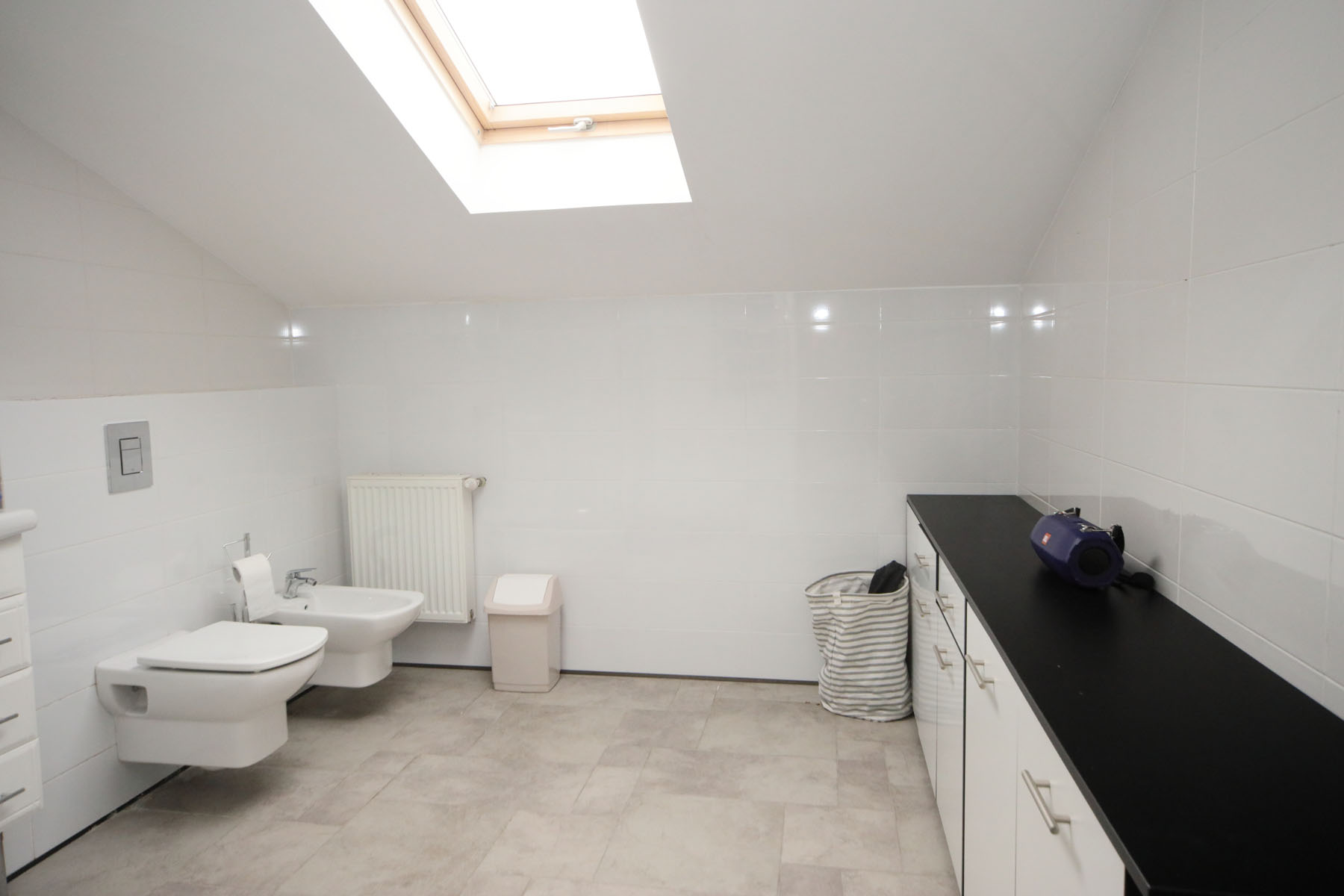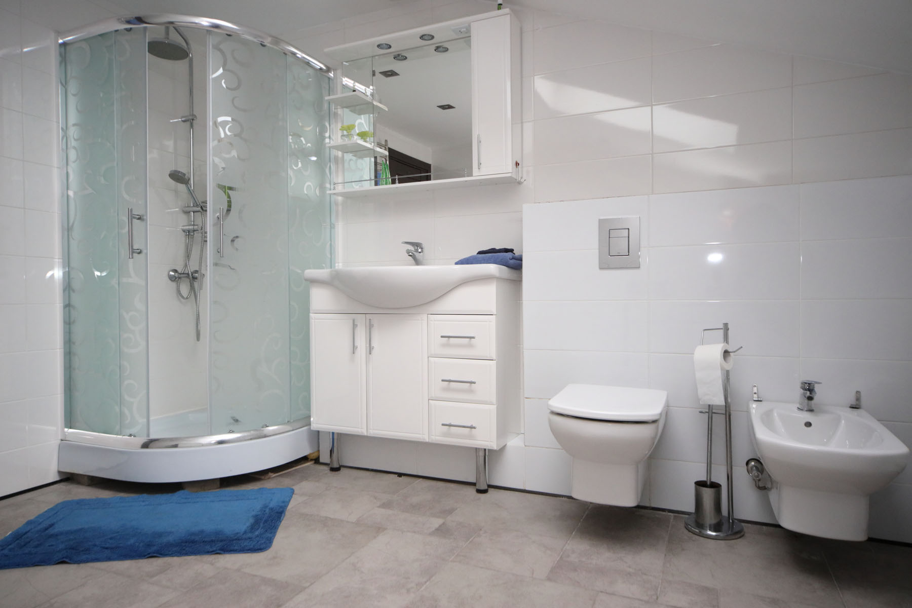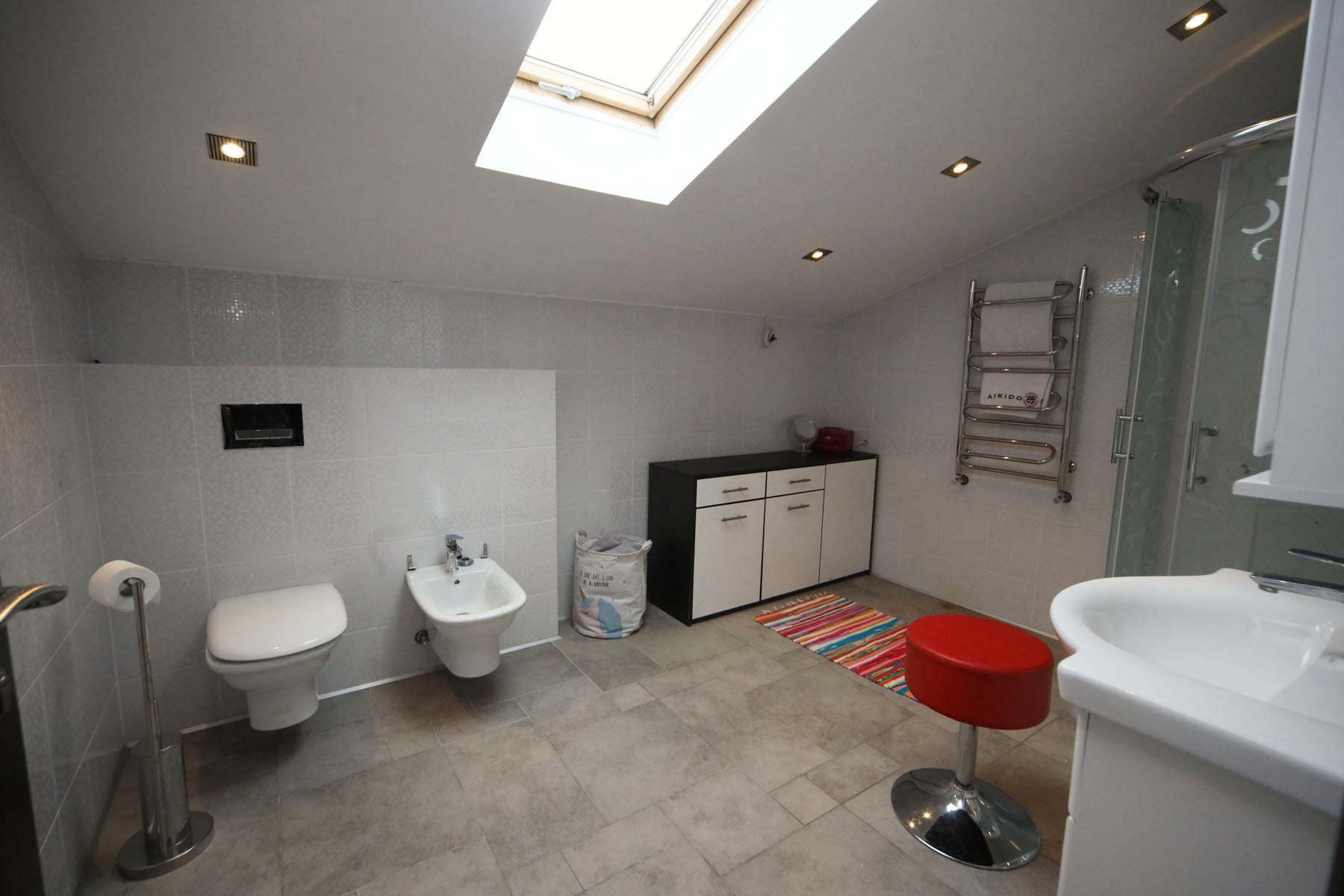 Індивідуальний санвузол другої дитячої кімнати, унітаз, біде, умивальник - вся сантехніка Kolo. Є душова кабінка і зручні шафи для зберігання рушників.